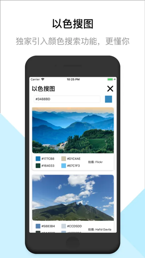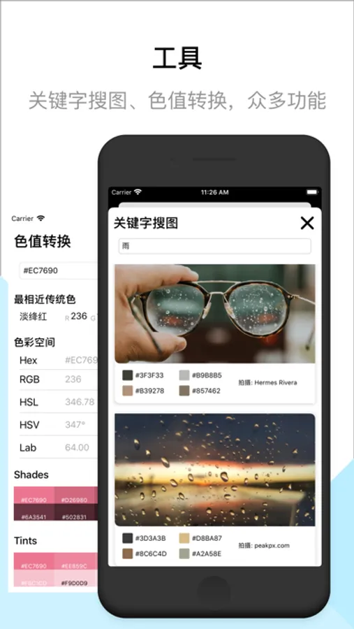 • 创新性引入以色搜图功能,通过色值找图片,就是这么简单