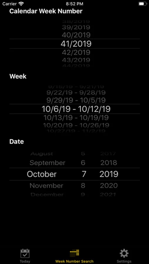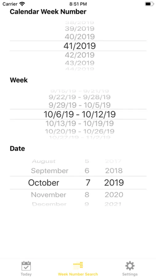 The app's search function makes it easy to find out the week number of a specific date. You can also find out which dates correspond to a selected week number.