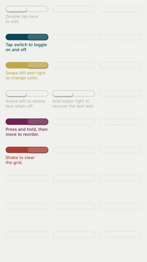 Double tap to edit. Tap switch to toggle on and off. Swipe left an right to change color. Swipe left to delete text when off. And swipe right to recover the last text again. Press and hold, then move to switch places in the grid. Shake to clear the grid.