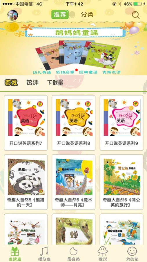 “点读云”是云智能点读笔用户的专用手机应用。通过这个应用,家长们可以管理云智能点读笔,实现笔中内容的增删改查,可以搜索、查阅、购买数千种精品中英文绘本图书,可以上传、下载海量的中英文图书音频资源,会讲故事的爸爸妈妈们不仅可以自己录制音频自己用,还可以分享出来给更多的孩子使用。