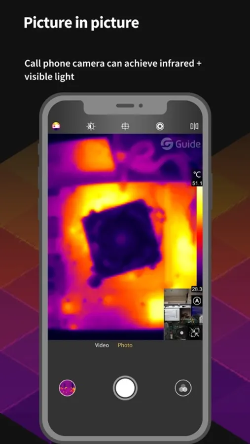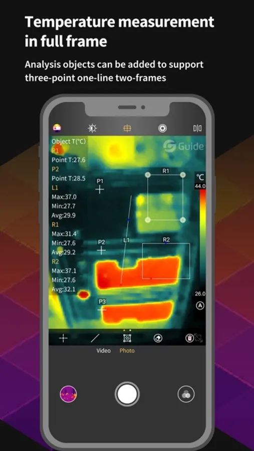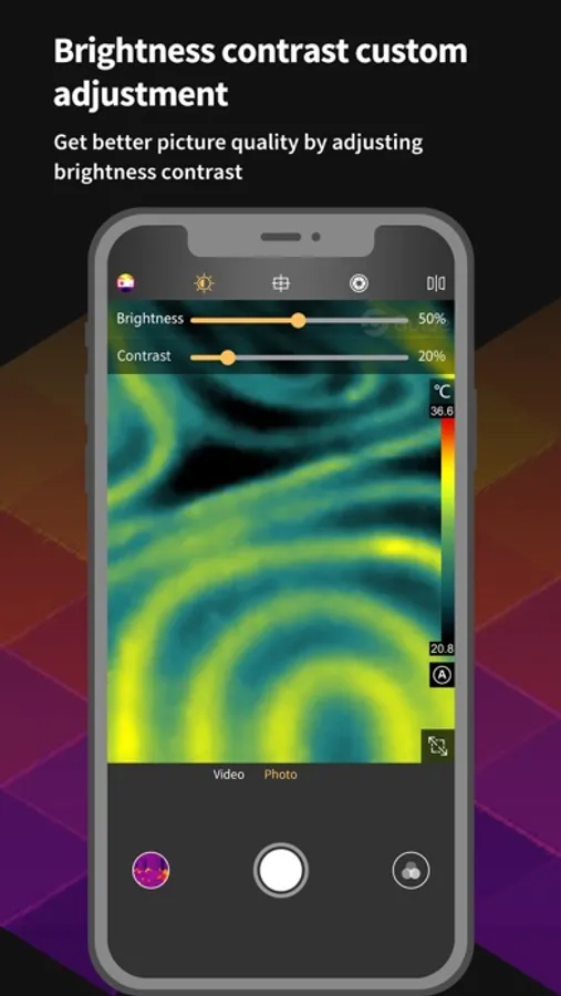 MobIR Air APP has the powerful function of professional thermal imaging camera. It can measure temperature in real time, switch color palette (including custom color palette), customize brightness contrast, take photos, video, parameter setting and analysis object. , picture and video browsing, re-analysis of photos, playback of video, cloud features and multi-language features. You can use this app to record the temperature of every moment in your life!
