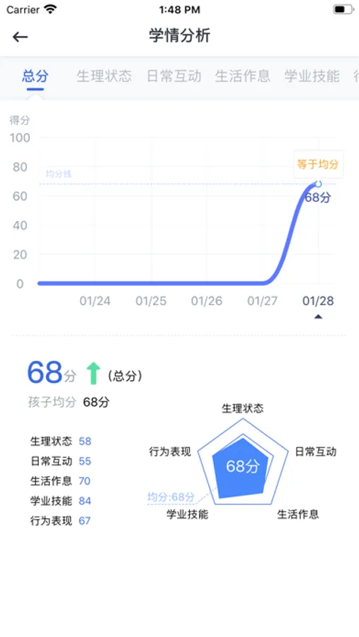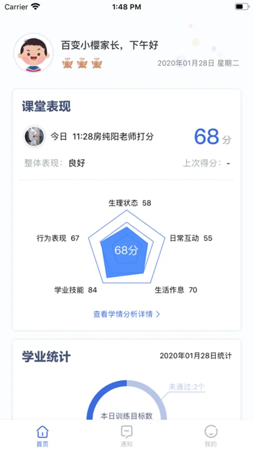 1.每日表现:多维度展示训练日常表现,时刻提醒家长关注孩子学习情况