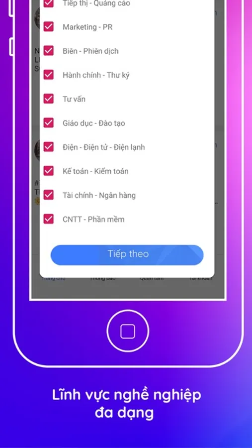 Người dung dễ dàng tạo 1 list nghề nghiệp Quan tâm ,để có thể nhận thông báo về công việc phù hợp hàng ngày, mọi lúc, mọi nơi.