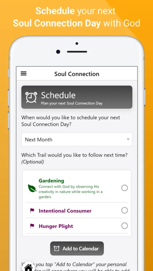 The Soul Connection app is not designed to replace your daily Bible reading and prayer time, but to be an additional resource you can use periodically (once a month, once a quarter, or several times per year) to spend a day with the Father.