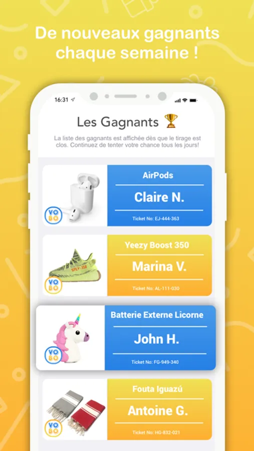 1 tickets MyCode vous est proposé gratuitement chaque jour. Participez aux concours de votre choix. Après chaque tirage au sort, rendez-vous dans votre espace personnel pour voir si vous avez gagné ! Augmenter vos chances en parrainant vos amis.