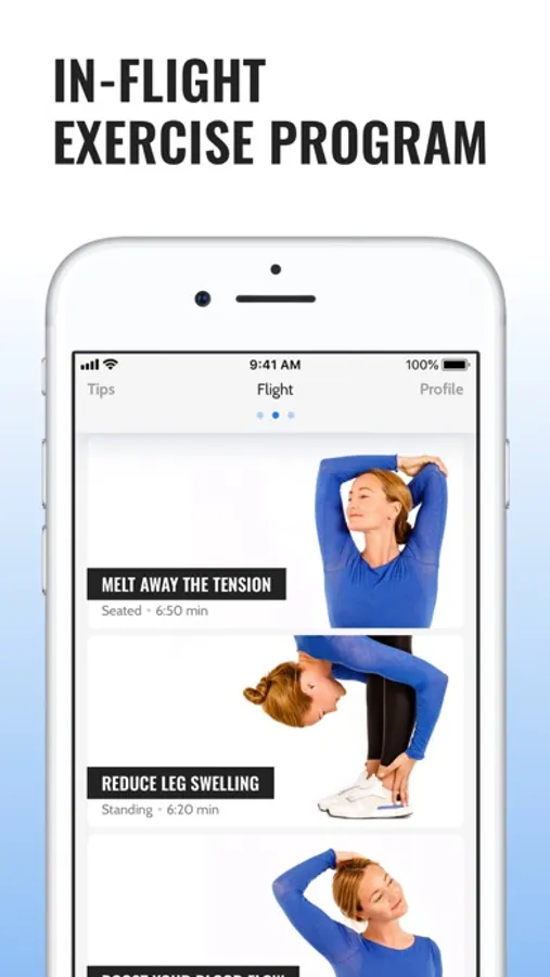 StretchitAir is an exercise program for stretching during flights. It’ll help prevent ankle swelling, muscle pain, stiffness, and dehydration – reducing the risks that make flying so hard on your body.