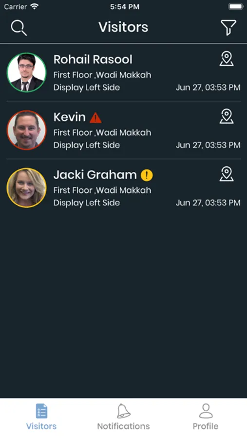 The system comes along with Visitor Tracker Mobile Application which is dedicated for security personnel for tracking all the visitors inside the building. The app also provides Alerts and Notifications for all the visitors. Such as providing Unauthorized movement alerts and notifications for all visitors over staying inside the building. Furthermore, it also provides complete list of visitors that are currently inside the building and also the list of visitors which are due to come for the visit. Security personnel can have the visitor details with one ease of click through mobile app.