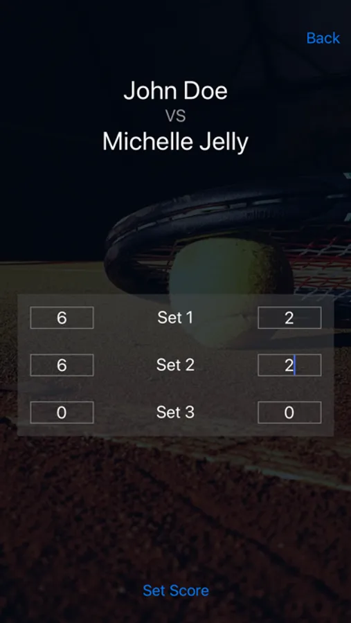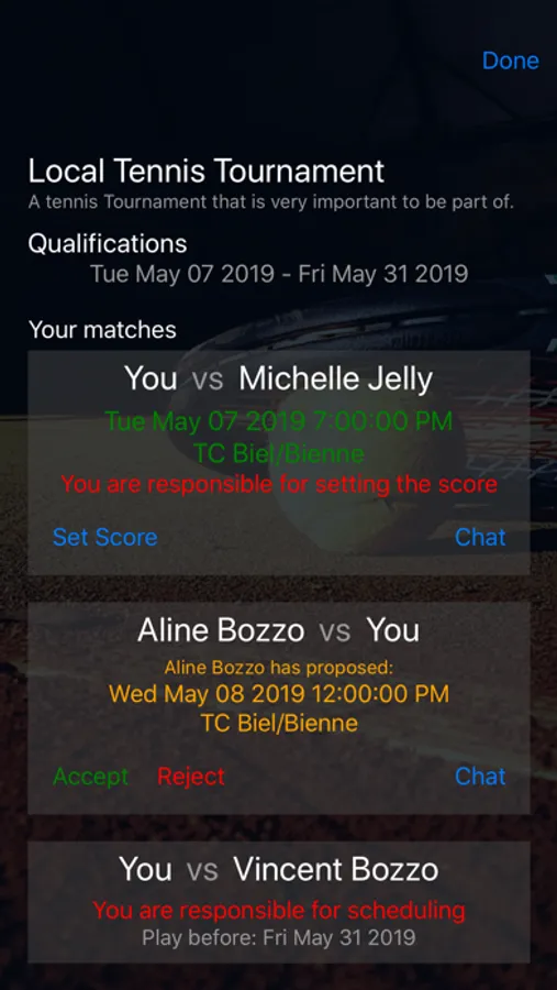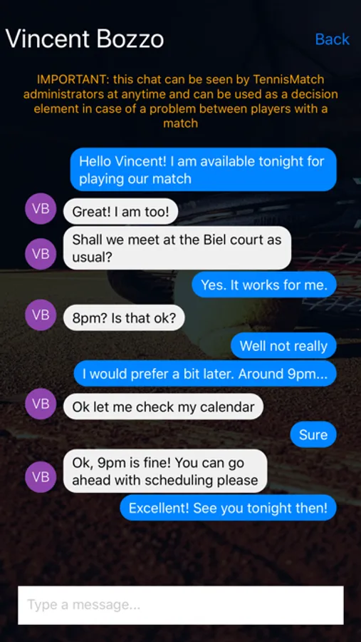 TennisMatch allows tennis players to get in touch and schedule their matches. The app provides a mechanism to ease the process of scheduling, enforcing the presence on the court and setting scores. Everything is synchronized with a server where tournament organizers can deploy and maintain their tournaments.