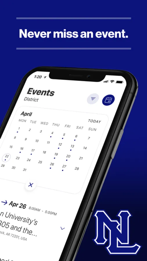 The event section shows a list of events throughout the district. Users can add an event to your calendar to share the event with friends and family with one tap.