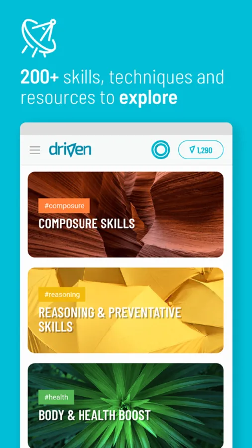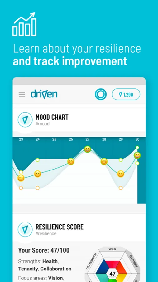 Driven has resilience activities across all these domains, and more. As an AI-powered coach, Driven chats you through these interactive activities to quickly lift your life to new heights in just minutes each day.