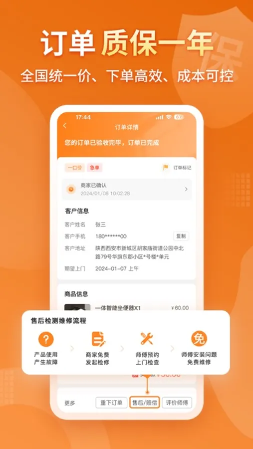-【服务守护】客服7*15小时在线,师傅全天待命,不论下单找师傅或售后难题,平台都以最快速度响应服务。