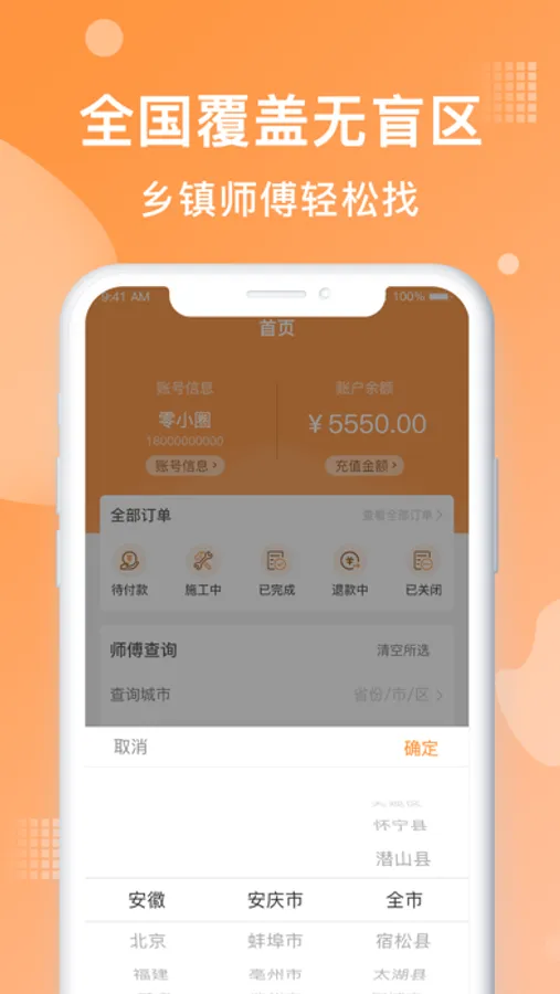 -【全国覆盖】160万+专业师傅,覆盖600城市3000区县40000乡镇,全国服务无盲区;