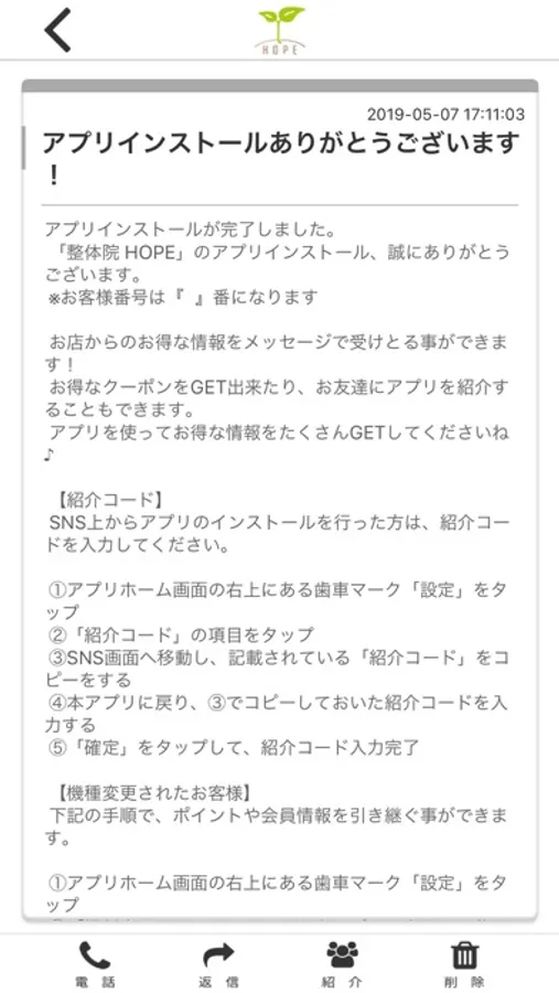 整体院HOPEのアプリをSNSを通じてお友達に紹介する事ができます。