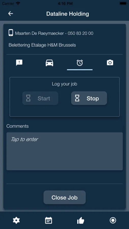 The time worked is recorded on site with the start/stop timer. The app sends the data in real time to the MultiPress system.