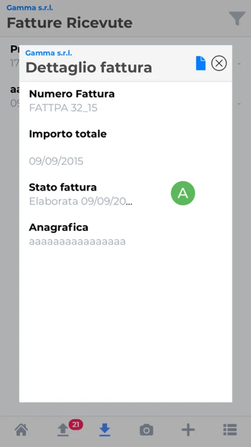 Consulta in ogni momento tutte le tue fatture ricevute. Tutti i dati della fattura a tua disposizione (importo, data, numero, destinatario) e puoi aprirla e visualizzarla.