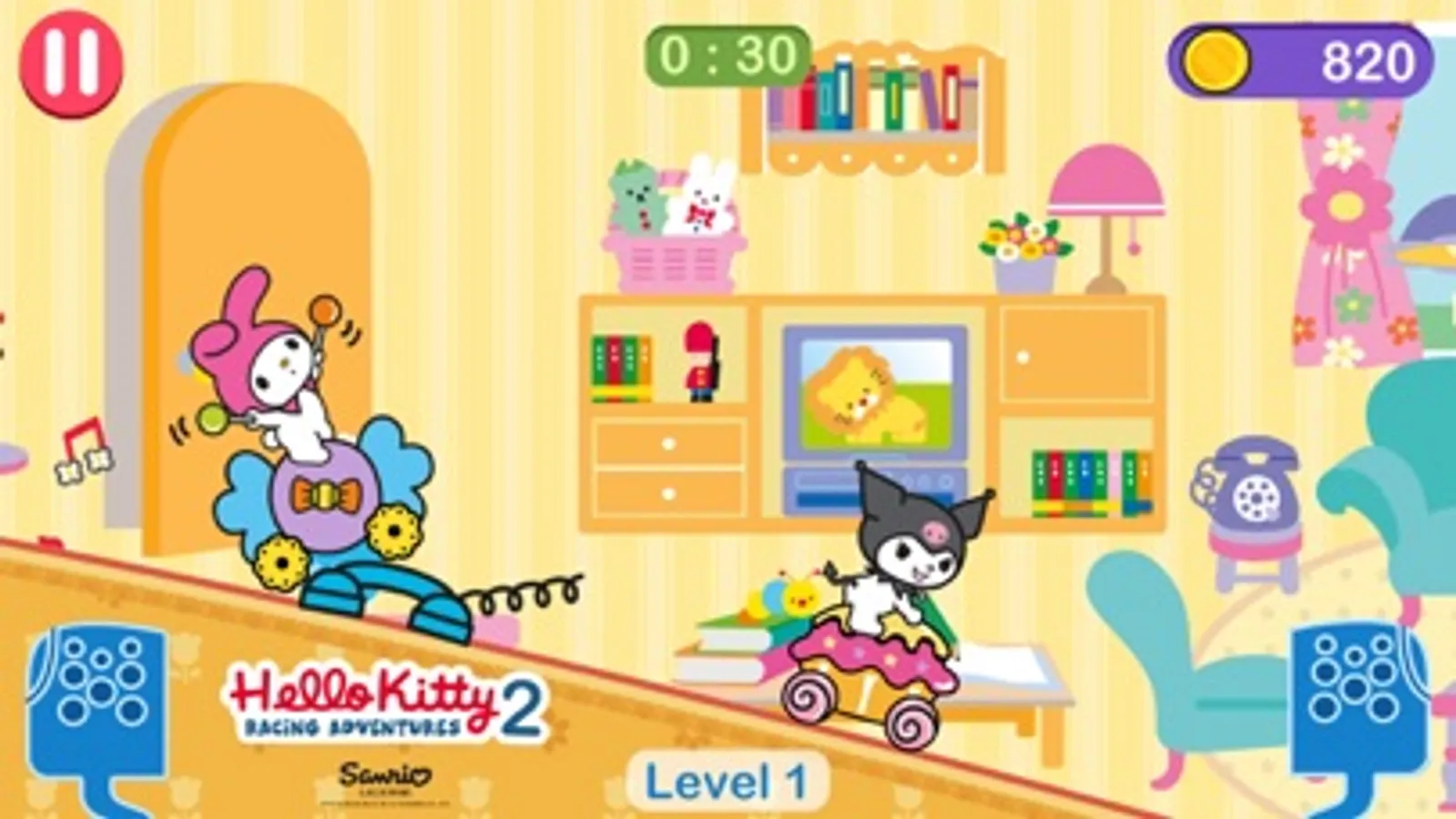 Join Hello Kitty and her adorable friends for another fun racing game - this time in Hello Kitty‘s house. A game that will entertain young children and bring a big smile on their faces, with lots of surprises waiting for them. Choose from the cute racing crew and their hilarious cars. Would you choose Kerokerokeroppi on a croissant, Bad Badtz-Maru on a crocodile or My Melody on musical drums? A unique racing experience for the little ones, where they pick their favourite kawaii character from Sanrio and get the race started. Who will win? Will Hello Kitty and her racing bow be the one to win the most stars or will the LittleTwinStars with their cloud-vehicle have the best finishing time? It all depends on the skills of driving - so let’s get going… ready, set, GO!