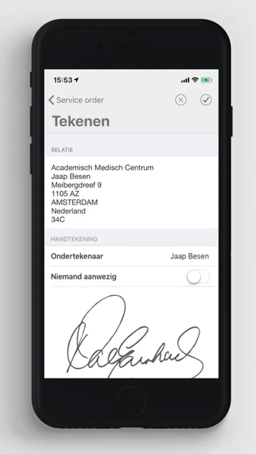 Een agendafunctie toont alle gemaakte afspraken waarvan uit direct de juiste service orders kunnen worden bekeken. Op de service order worden alle relevante gegevens getoond zoals het adres van de klant, de reparatie omschrijvingen en de mogelijkheid om zijn uren en materialen toe te voegen. De service order kan via deze app, digitaal getekend worden door de klant. Hierbij krijgt de klant op het scherm te zien welke werkzaamheden zijn uitgevoerd, welke materialen en hoeveel uren de monteur heeft gewerkt. Door volledig digitaal te werken met deze Service app bespaart men enorm veel papier. Ook is het proces bijzonder efficiënt. Het tekenen van de service order leidt tot eventuele facturatie van de service order.