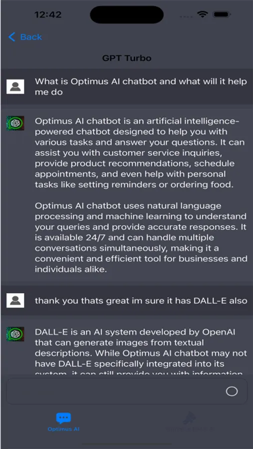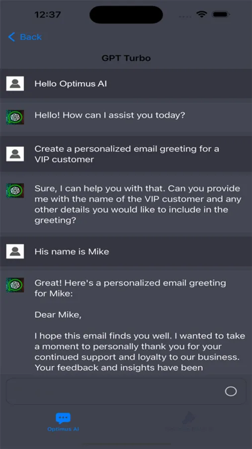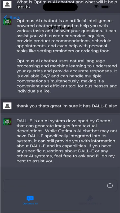 With Optimus AI, you have the world's most advanced chatbot at your fingertips. Engage in dynamic, natural conversations and witness the app's ability to understand and respond with astonishing accuracy. From answering your burning questions to providing insightful advice, Optimus AI is here to make your interactions smarter, faster, and more enjoyable.