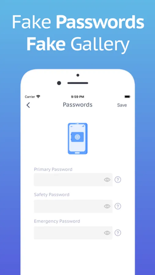 With Safe Box: Secret Photo Vault + we offer you a secondary safety password and a third emergency password. With safety password you can create a second home page for safety. When there is someone else searching your phone, safety password will direct to an empty and safe home page in SafeBox