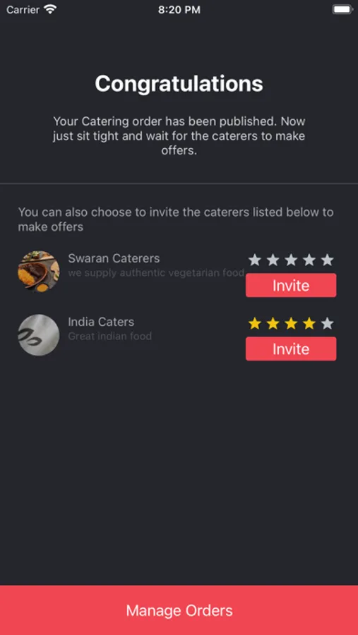 Caterers in your area will make offers on your order and in no time you will have multiple offers to review with the caterers ratings and review. Whats more, you can chat with all the caterers who have made an offer and accept the one you like.