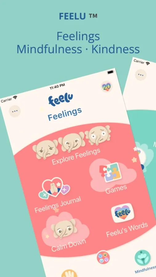 Feelu has three worlds: Feelings, Mindfulness, and Kindness.