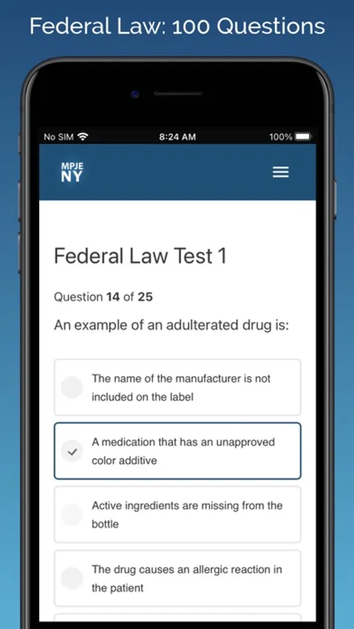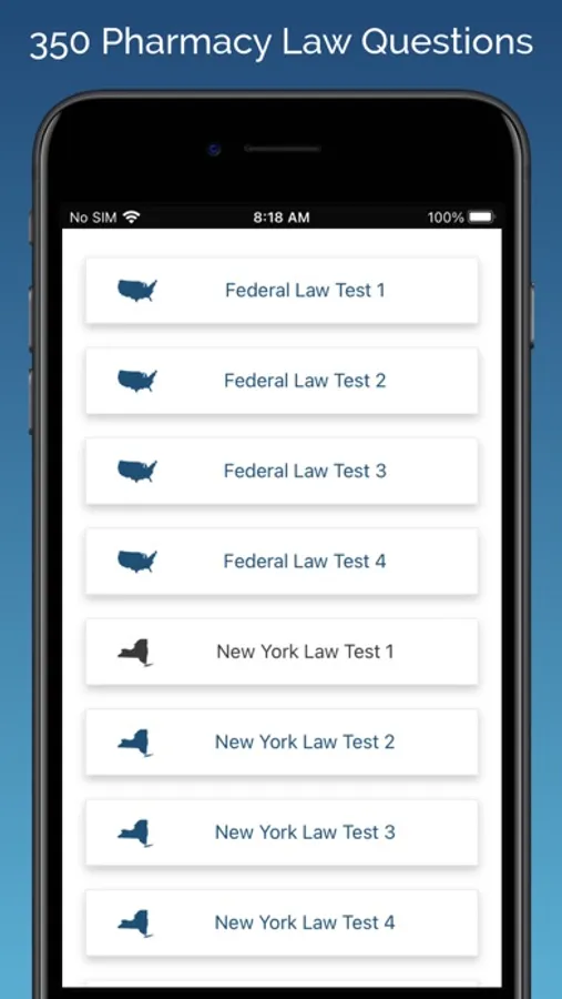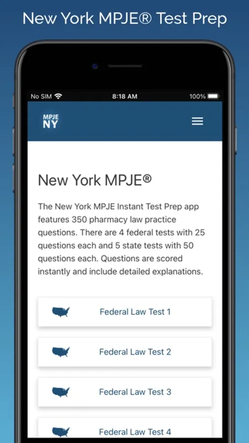 The New York section includes 5 exams with 50 questions each. The Federal section includes 4 practice exams, with 25 questions each. This app covers all of the major topics that are found on the NY Multistate Pharmacy Jurisprudence Examination (MPJE®).