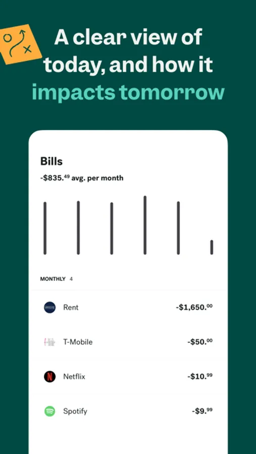 Unlike tedious budgeting tools, our custom dashboard reflects the current and future state of your money, including income, bills, budget, and progress towards goals.