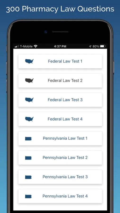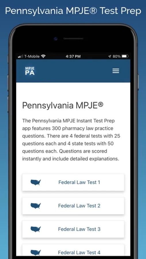 The Federal section includes 4 practice exams, with 25 questions each. The Pennsylvania section includes 4 exams with 50 questions each. This app covers all of the major topics that are found on the PA Multistate Pharmacy Jurisprudence Examination (MPJE®).