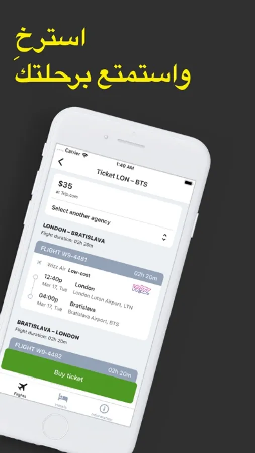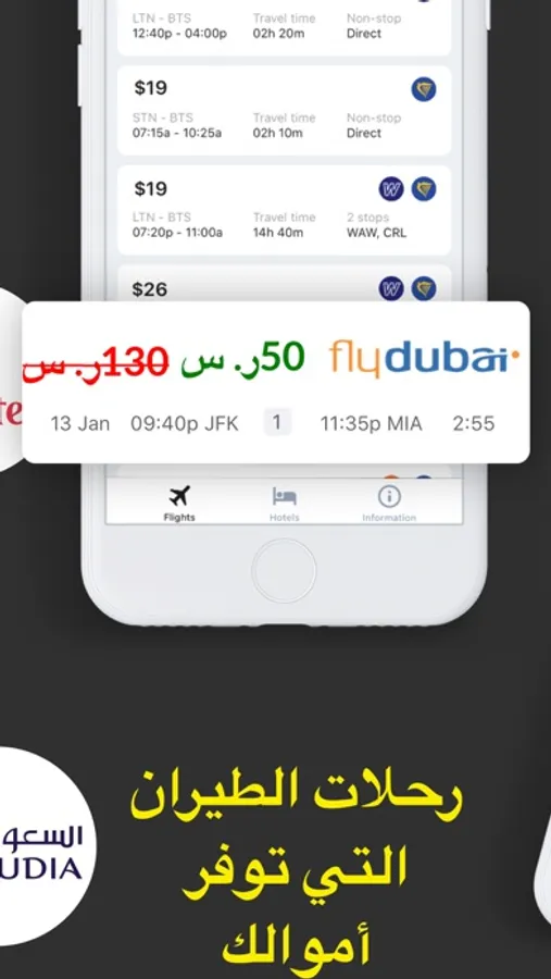 حجز أرخص رحلات الطيران لم يكن بهذة السهولة من قبل! سيقوم تطبيق رحلات الخصم بالمقارنة بين أسعار تذاكر الطيران من مئات شركات الطيران ووكالات السفر، وسيقوم بتوصيل عروض مثالية إلى جهازك مباشرةً.