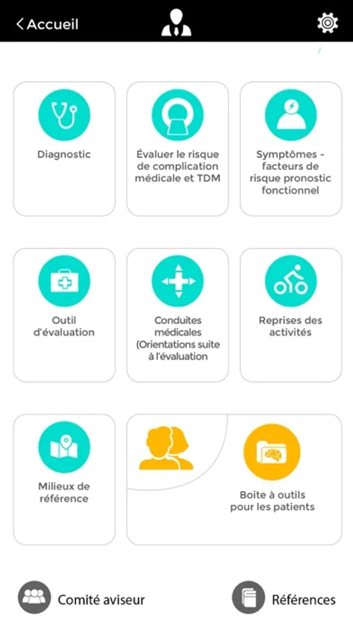 The free mTBI application offers emergency and first-line responders recent evidence-based tools for the management of mild traumatic brain injury (mTBI). This bilingual application (English and French) is intended for clinicians (doctors, nurses, health professionals) who work with adults and children who have suffered a mTBI. The application contains readily available information on diagnostic criteria, symptoms and risk factors for medical complications (Canadian CT Head Rule and PECARN), and risk factors for poor prognosis. In addition, step by step recommendations to resume intellectual and physical activities are clearly presented. The application also includes mTBI assessment tools for health practitioners (Rivermead post-concussion symptoms questionnaire, SCAT5, etc.), a list of clinical references and a toolbox for patients.