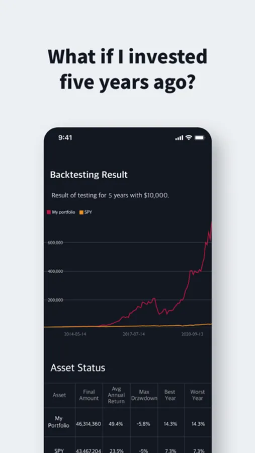 The past is a mirror that shines on the future! Use the backtesting engine provided by The Rich to make sure to simulate with past data before investing. You can check the results of backtesting comparing your portfolio to the S&P 500 market index with just one button click in your portfolio. If youI had run your portfolio five years ago, how much would it be now? Aren't you curious? Right now, The Rich!