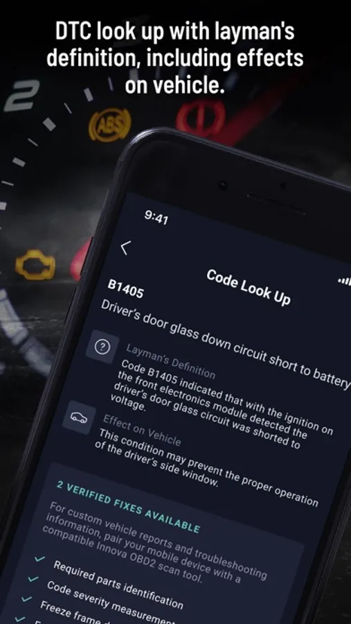 - Lookup DTC Code Definitions – Access to specific, layman’s, effect on vehicle, all paired with ASE-verified fixes at your fingertips.