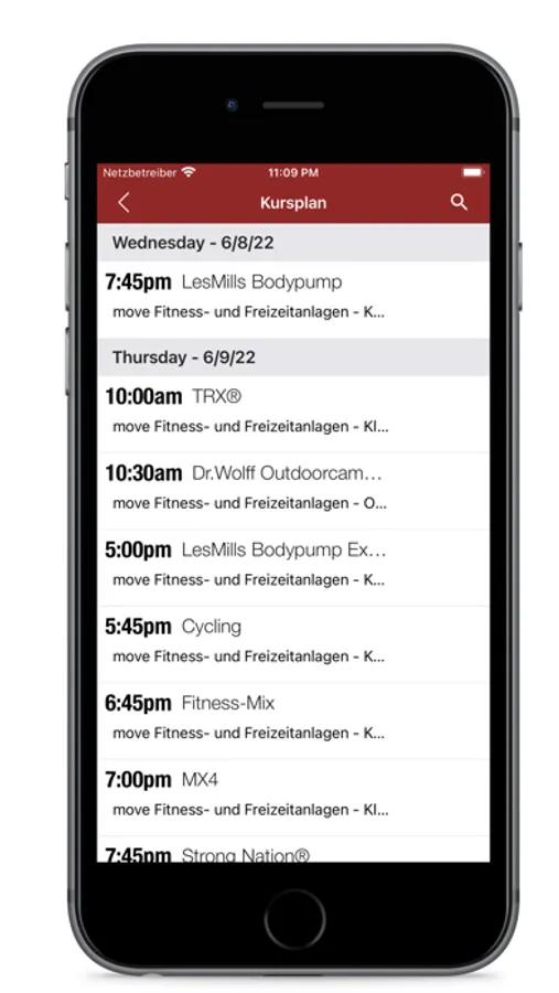 Direkter und aktueller Zugriff auf den Kursplan von überall: Für jeden Kurs kannst Du Details wie Zeit, Kursbeschreibung, Raum und Merkmale wie z. B. den Schwierigkeitsgrad einsehen.
