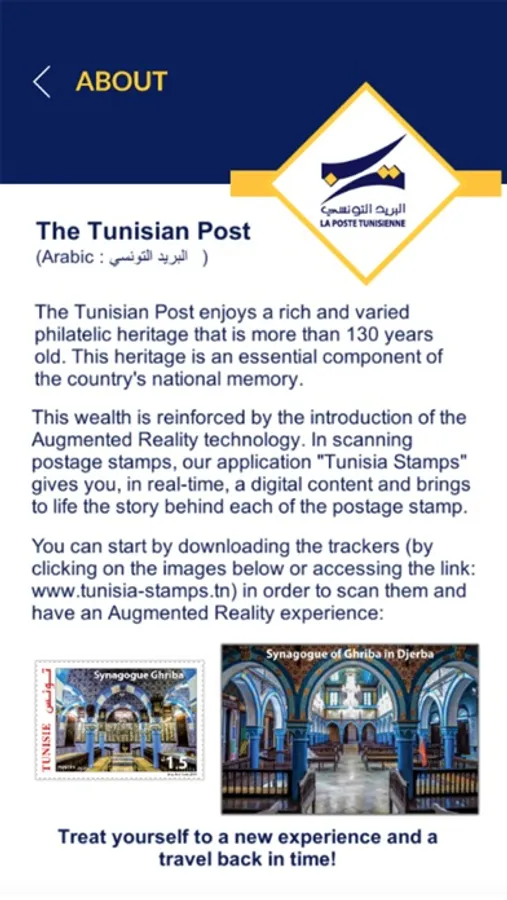 The Tunisian Post enjoys a rich and varied philatelic heritage that is more than 130 years old. This wealth is reinforced by the introduction of the Augmented Reality technology. Our application "Tunisian stamps" gives you, in real-time, a digital content and bring to life the story behind each of the postage stamp.