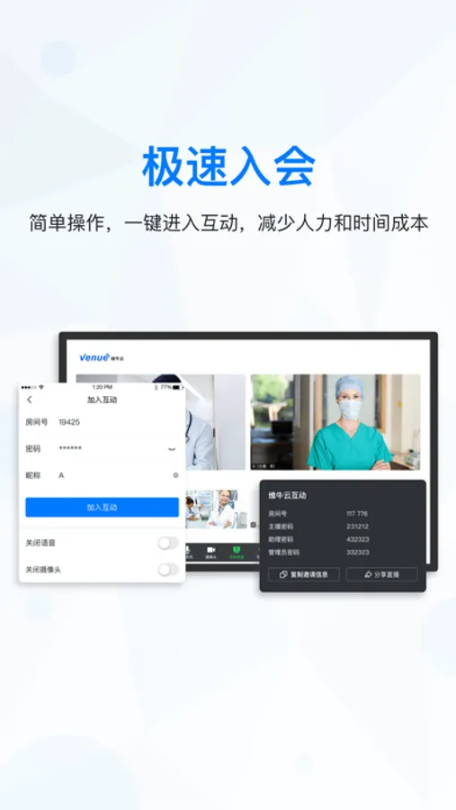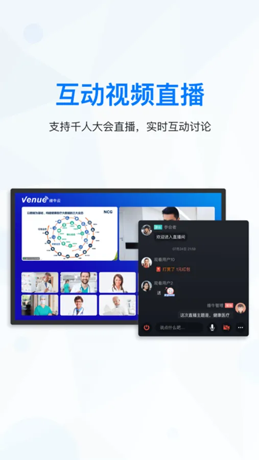 维牛云,极其简单的多人会议直播平台!全球唯一支持普通网络下即可64人实时高清互动的多人直播平台。支持5万人同时围观毫无压力!支持桌面共享、支持多人直播、实时云端录制5秒即可回看。一键微信邀请他人参会,会议直播从未如此简单。