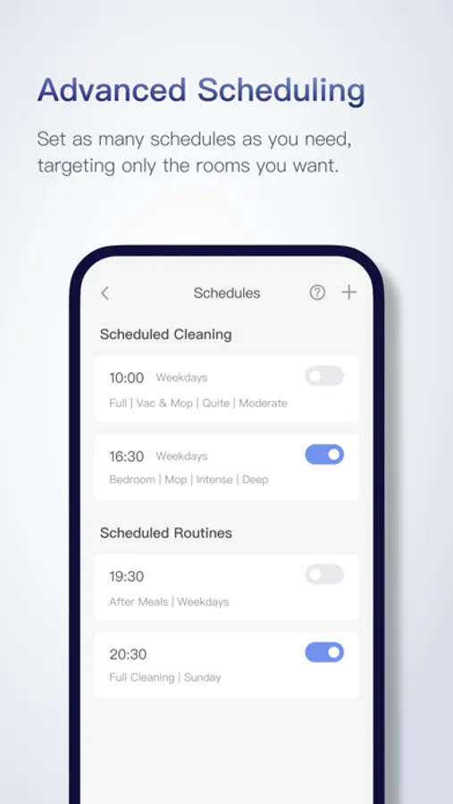 Set multiple schedules from hourly to daily to weekly, hitting different rooms with each one. You can clean the kitchen after breakfast and even the whole house when everyone's gone out.