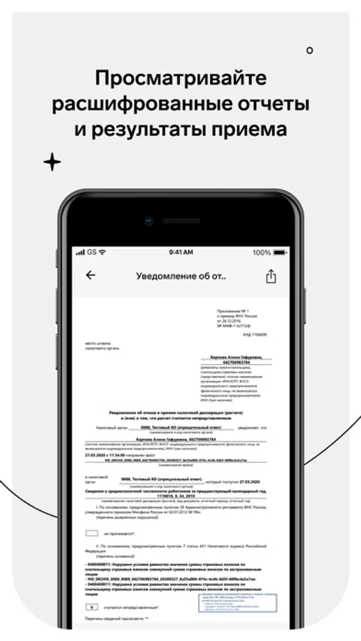 Вся цепочка документооборота у вас перед глазами. Просматривайте отчеты, переданные в ФНС и Росстат, а также поступившие извещения, квитанции и уведомления. Документы доступны в приложении после расшифровки в Экстерне.
