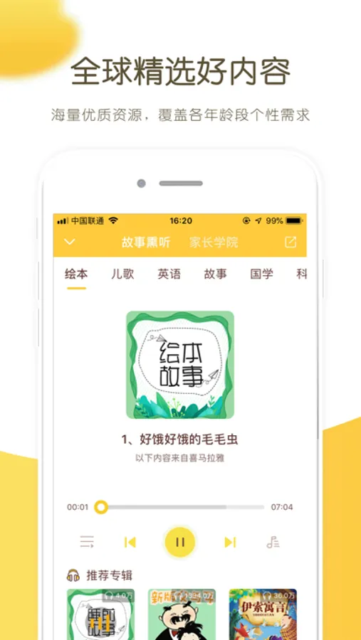 2、强大的内容库囊括了专家推荐数万册本淘宝、京东、当当网经典、热门绘本,小学英语、语文教材等,优秀主播专业录制精读音频;