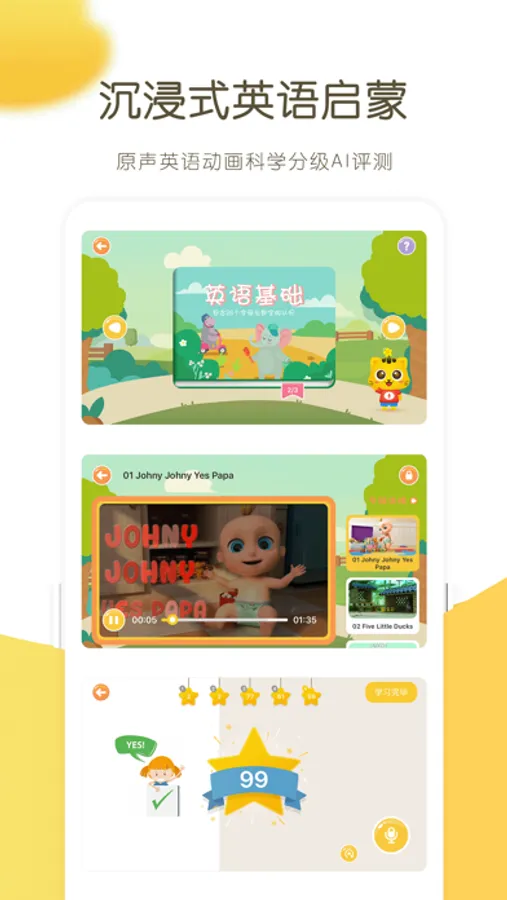 2、高频互动解锁学习:专设英文动画看听说练习全覆盖的分级学习框架,A.I发音纠错。激发参与积极性,提升学习效果。