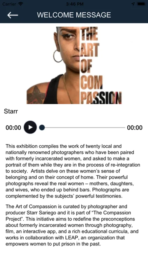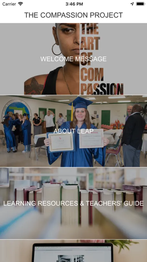 The Compassion Project, a multimedia exhibit, features formerly incarcerated women. The exhibit engages the senses through listening, seeing and experiencing with photo portraits, stories, and film. This APP features a curriculum guide for high school and college students, robust learning resources, a writing contest and actions to take for making a difference.