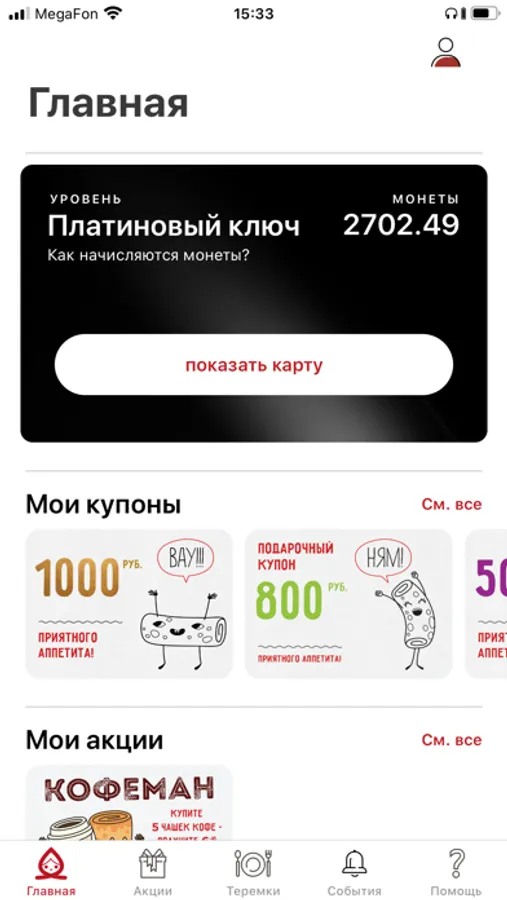 На кассе перед оплатой заказа сообщите, что вы хотите использовать Монеты. Откройте главную страницу приложения, нажмите "показать карту" и продиктуйте кассиру цифровой код. 1 монета - это 1 рубль вашей скидки.