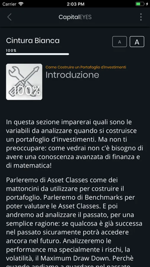 Crea portafogli con limiti di rischio definiti, utilizza gli strumenti che hai sbloccato nell'Area Learning, e guarda gli effetti dei movimenti dei mercati sul tuo portafoglio. Un tutor virtuale ti darà dei feedback regolarmente per aiutarti a comprendere l'andamento del tuo portafoglio.