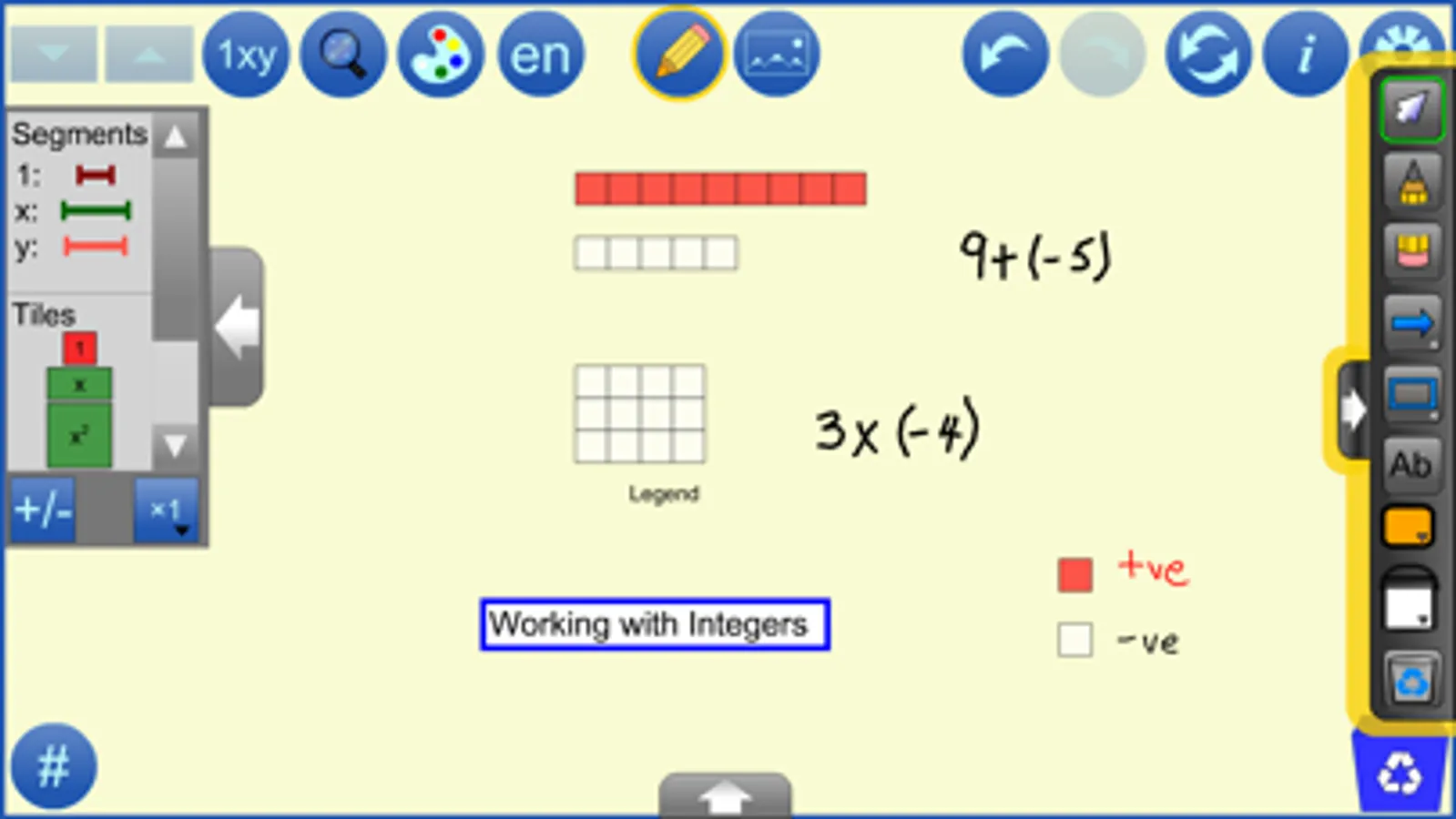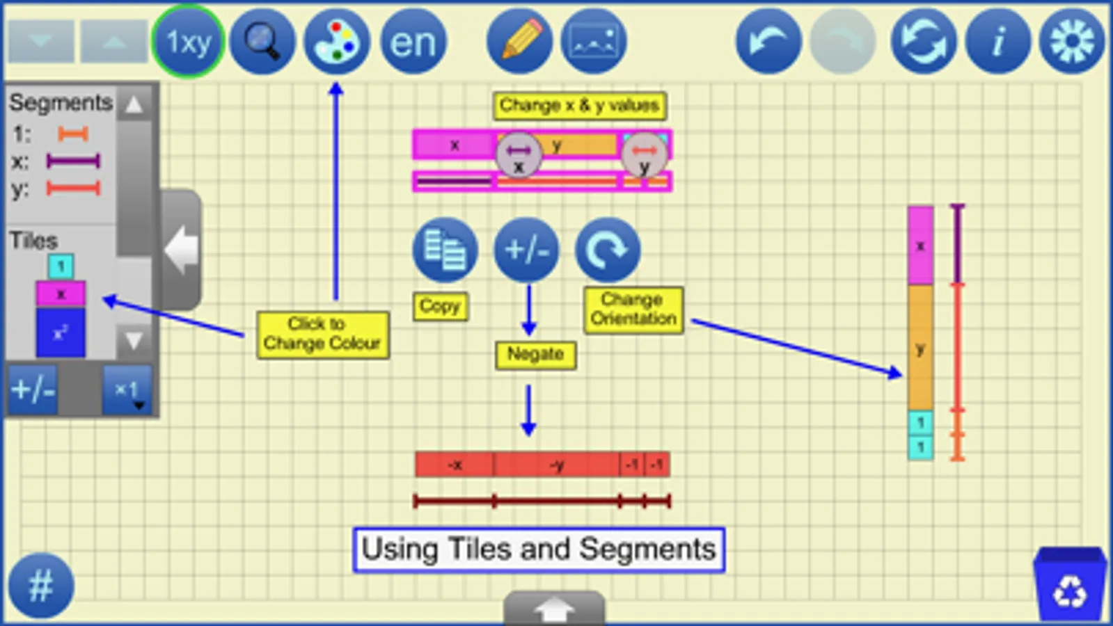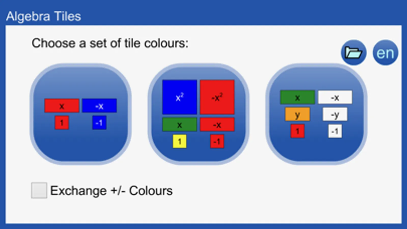 The Algebra Tiles Tool is a virtual manipulative similar to the physical ones commonly available in classrooms. Tiles representing 1, x, x² ,y ,y² and xy long with their opposites can be dragged into the workspace from the scrollable selection panel at the left. Once in the workspace they can be moved, copied, re-oriented, or negated individually or in groups. The tiles can be configured to match the colours of common physical sets. Unlike the physical tiles, the value of x and y can be adjusted. The virtual tool also contains 1, x, and y line segments.