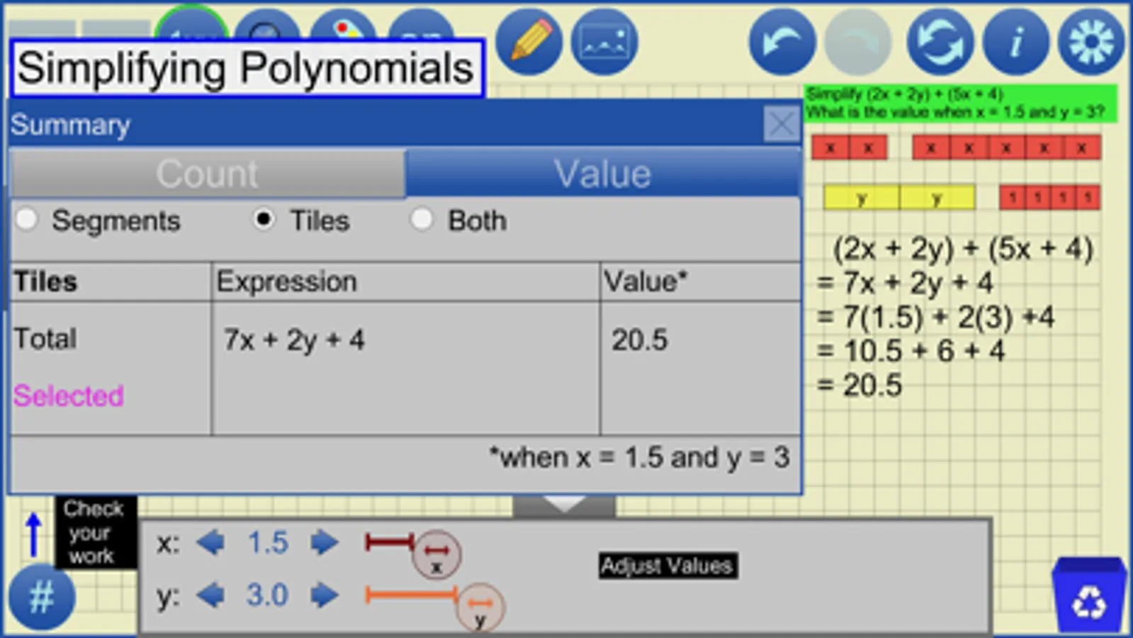 • Use the Summary button (#) to see information about the objects in the workspace.Information is provided for all objects in the workspace as well as for those objects which are currently selected. The Count tab shows how many of each type of object is in the workspace. The Value tab shows the simplified algebraic expression and its numerical value for the current values of x and y.