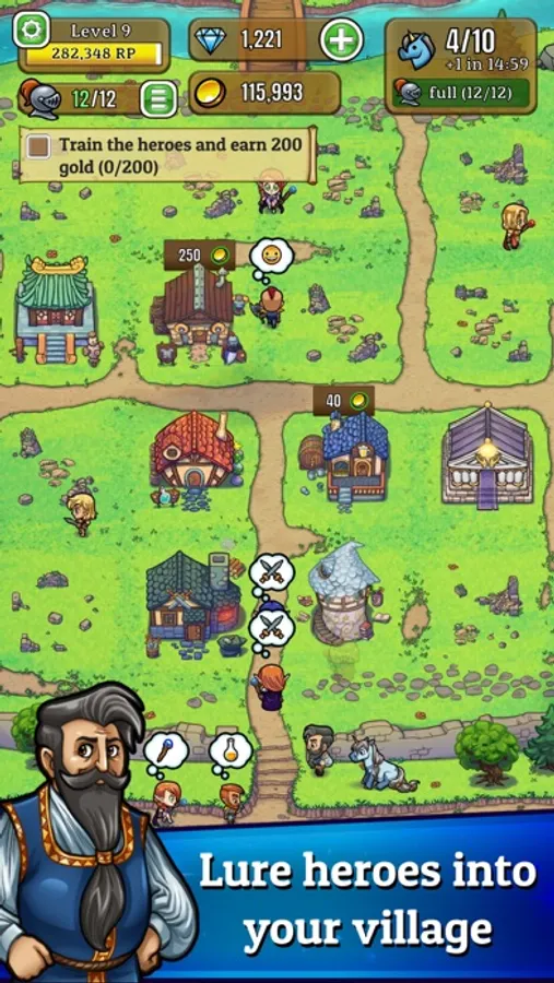 Create the perfect illusion of an adventure village with busy blacksmiths, bustling taverns, and glorious dungeons with monsters bred by you. Meet fascinating characters who want to join you and use their skills to lure the hero's gold out of their purses. Make Hero Park what it used to be: the most magnificent village in the kingdom!
