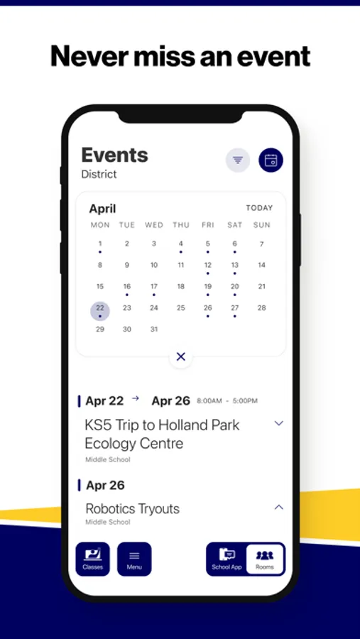 The event section shows a list of events throughout the district. Users can add an event to your calendar to share the event with friends and family with one tap.