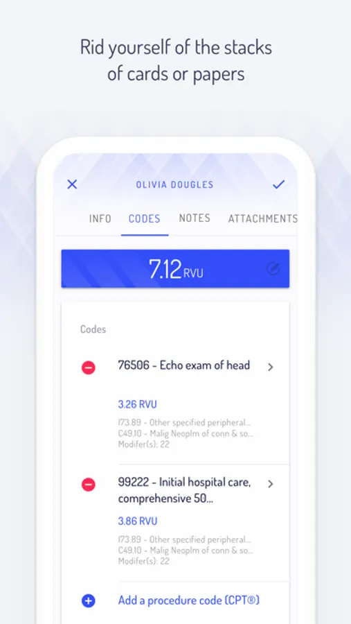 - Codes: easy access to CPT, modifiers and diagnosis codes
