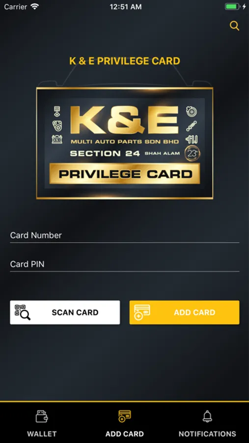 With the K & E Privilege Card App, we give you the convenience of collecting and redeeming points without the presence of a physical card. You can check your point balance, transaction history, and receive the latest promotions of Genuine Spare Parts.