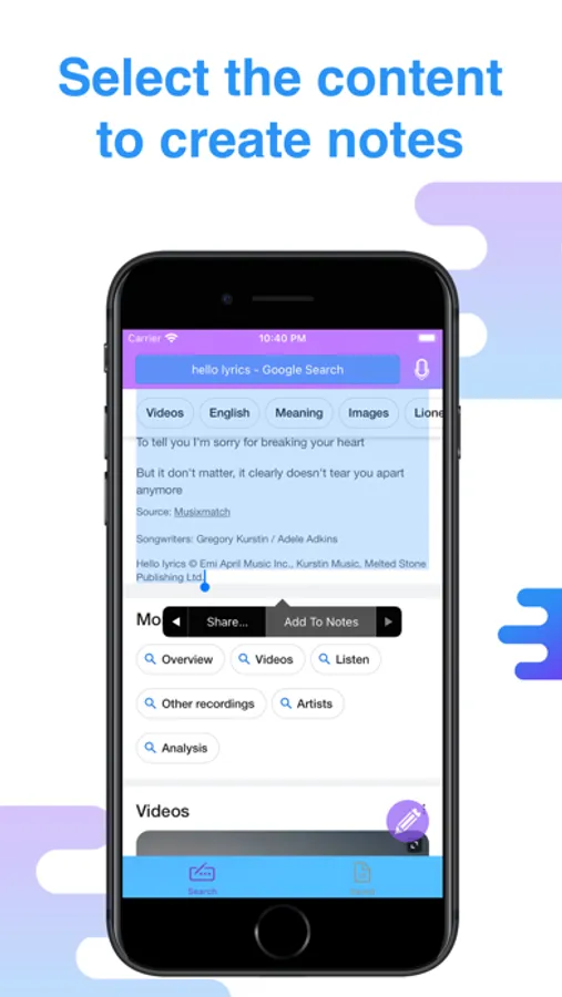 Now do web search and create notes in a single app. This app provides you ability to create notes while doing your research work. Create notes, view, edit and share it.
