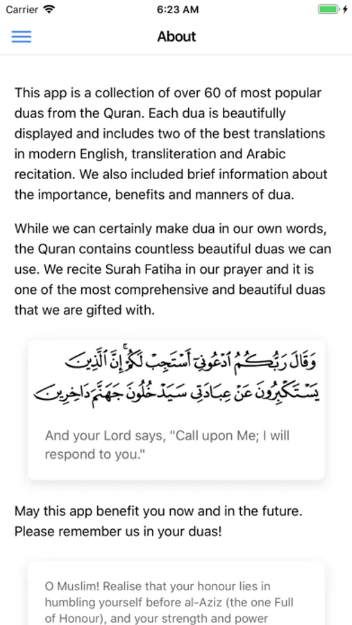This app is a collection of authentic Islamic duas with modern translation and no ads. Authentic Duas includes over 63 authentic duas from Quran with audio and modern English translations from Dr. Mustafa Khattab and Prof. Abdul Haleem. We have also included manners of dua and best ways to make dua. Many more features are on our roadmap.
